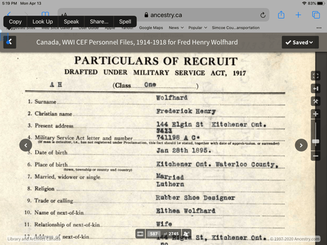 Frederick worked for the Merchants Rubber in Berlin and was transferred to a division in Granby, Quebec in 1914. Below is the news clipping from 1914 noting the transfer but below that, his war recruitment record notes his address in 1917 as Kitchener?