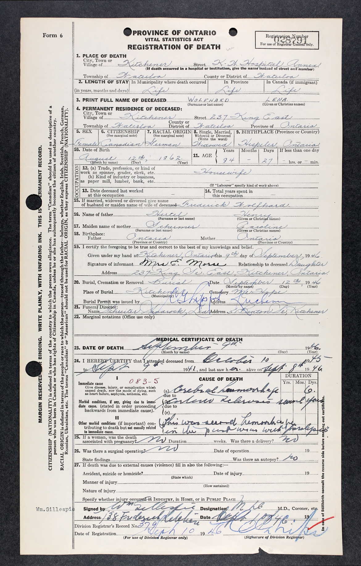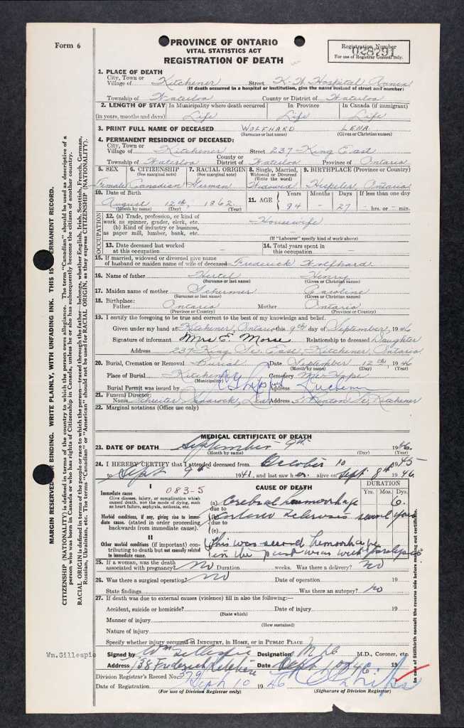 Previous Image Next Image Obit Frederick’s wife, ‘Lena’ Registration of Death. Note that her daughter, Emma Morse witnessed the document and is listed at residing at 237 King Street East in Kitchener in 1946