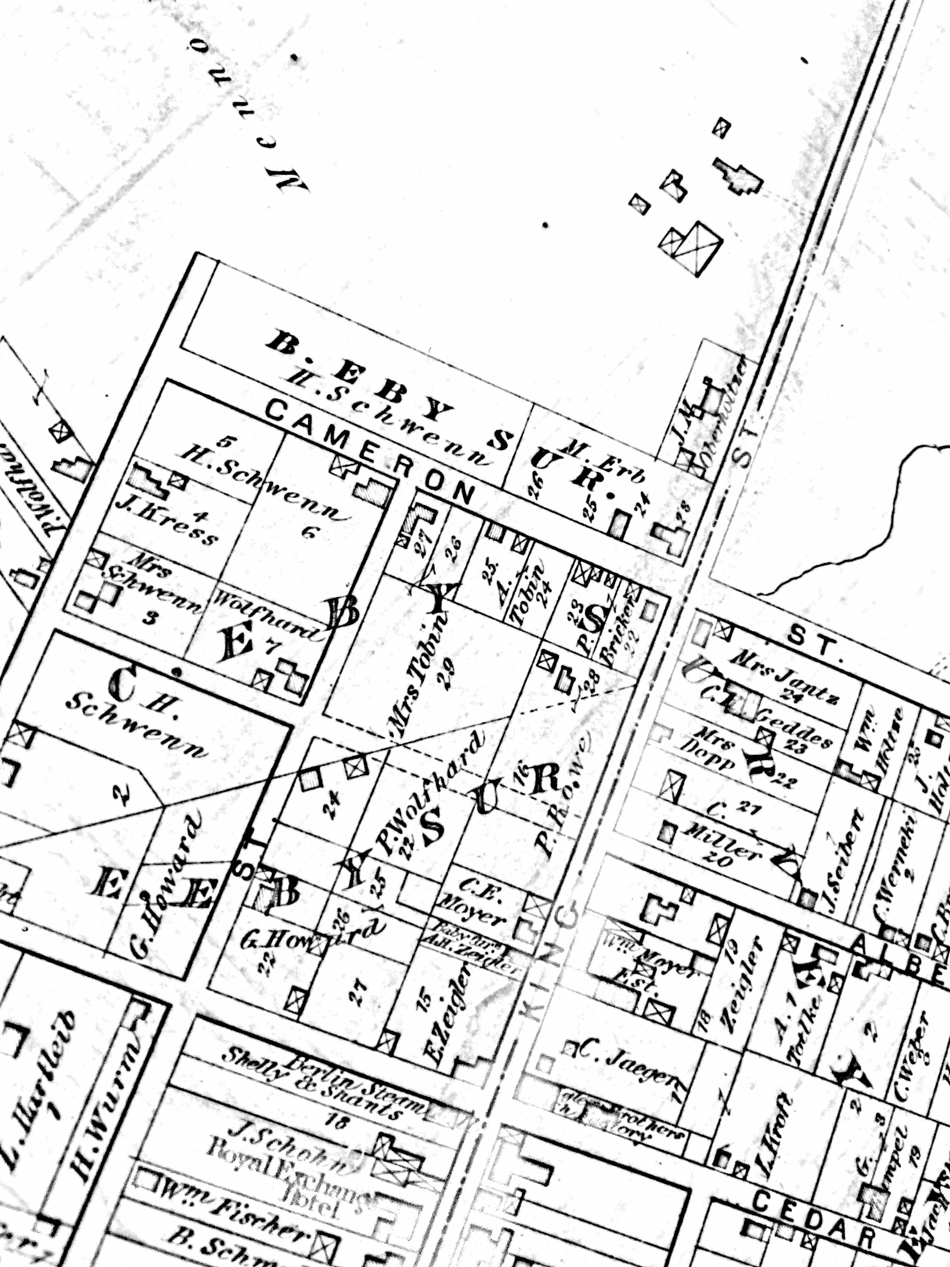 Previous Image Next Image 1879 map close up Shows properties owned by Peter Wolfhard on Albert Street, Elgin Street and Weber Street