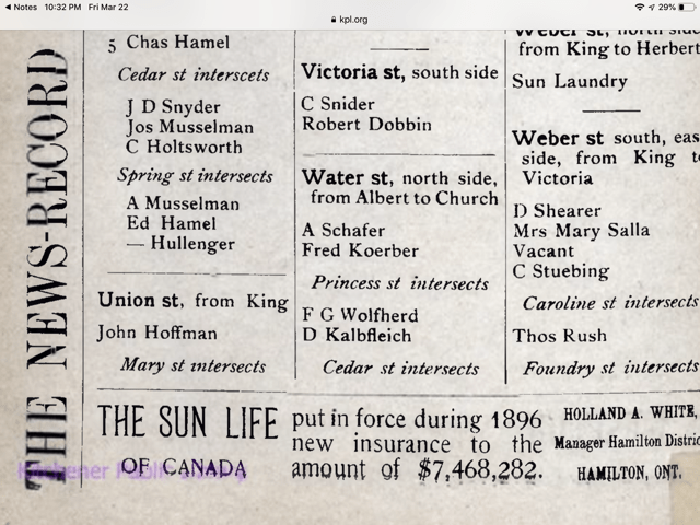 In 1897, Frederick lived at the corner of Water Street (now called Dorset Street) and Princess Street in Waterloo, behind the Ewald House. The Ewald House later was called the Kent and presently the Huether Hotel. The Ontario Land Registry shows the block surrounded by King, Princess and Water Street was owned by the Knutz Brewery / Ewald family since 1910. The Ontario Land Registry records for this area do not show ownership of properties before 1910. The 1920, 1921, and 1925 Vernon directories note he lived in Waterloo, behind the Hotel.