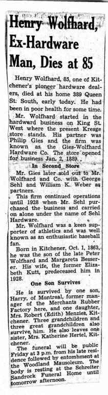 In 1928, Henry Wolfhard and William K. Weber sold the business to Mr. Sehl who carried on as Geo. Sehl Hardware and moved it to 62 King East.