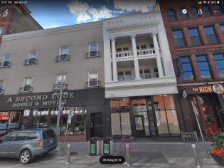 was adjacent at 35 King West. The building is still standing and appropriately called today the ‘White Pillar Suites’. In 1931, the title of the Wolfhard Apartments changes to Kresge.