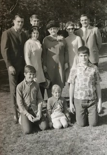 Previous Image Next Image 1966, Grandchildren of Louise Knechtel- back row, Dick Luening, John Kolb, Bob Luening. middle row, Susan Wolfhard, Grandmother Knechtel, Mary Jane Luening. front row, Peter Wolfhard, Julie and Jim Kolb