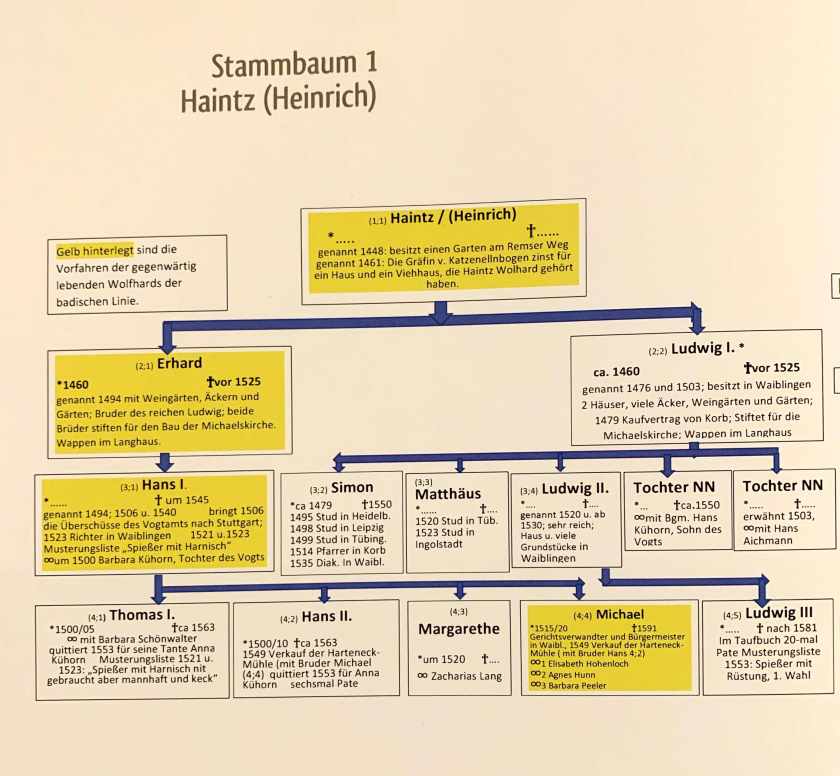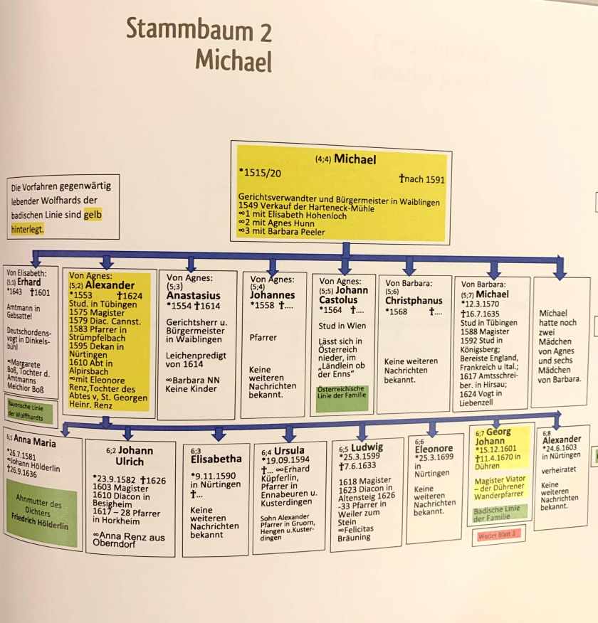 The Wolfhard Family Tree continues back through Germany through the highlighted ancestors. Note at the bottom of the above tree, Johann Peter, is Peter Wolfhard who emigrated to Berlin, Canada in 1854. He was one of eleven children. Many thanks to Manfred Wolfhard of Germany for this information. Manfred sent me a bound book of the Wolfhard history. The Wolfhard Tree goes back to 1448. Follow through the pages of the following Stammbaums from the book.